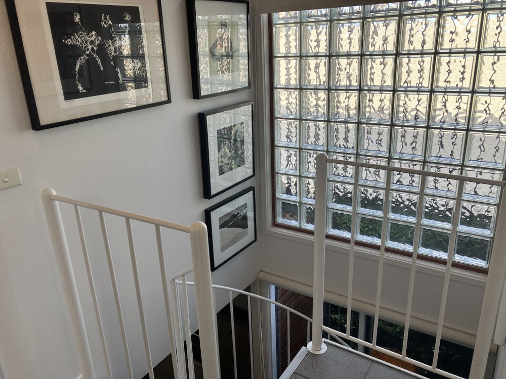 • A striking circular staircase leads to a luminous second-level glass atrium, framed by a privacy-enhancing glass brick wall