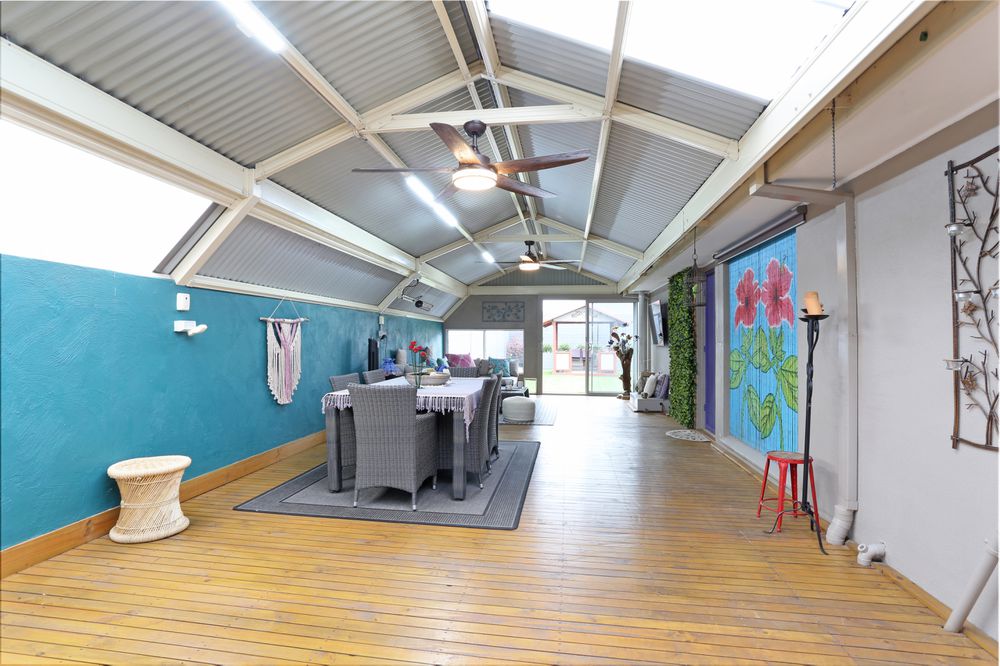 The heart of the home is a contemporary kitchen with stainless steel appliances and timber benchtops, flowing into spacious living and dining zones. Step outside to a covered entertaining area complete with ceiling fan, heater lamp, and electrical setup - perfect for year-round gatherings.