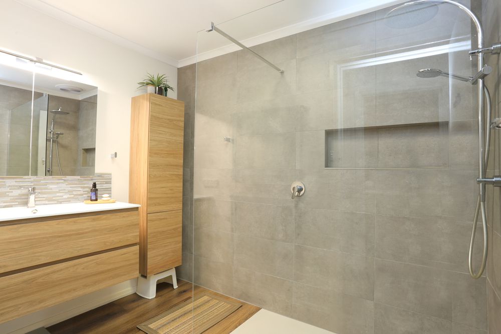Inside, the home features a clever His-and-Her bedroom setup, each with its own walk-in robe, fitted with premium storage solutions. The modern bathroom showcases floor-to-ceiling tiling and a sleek open shower, while the laundry offers generous storage and direct deck access.