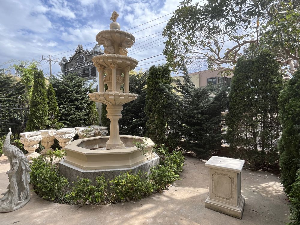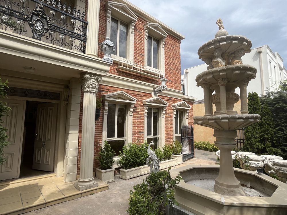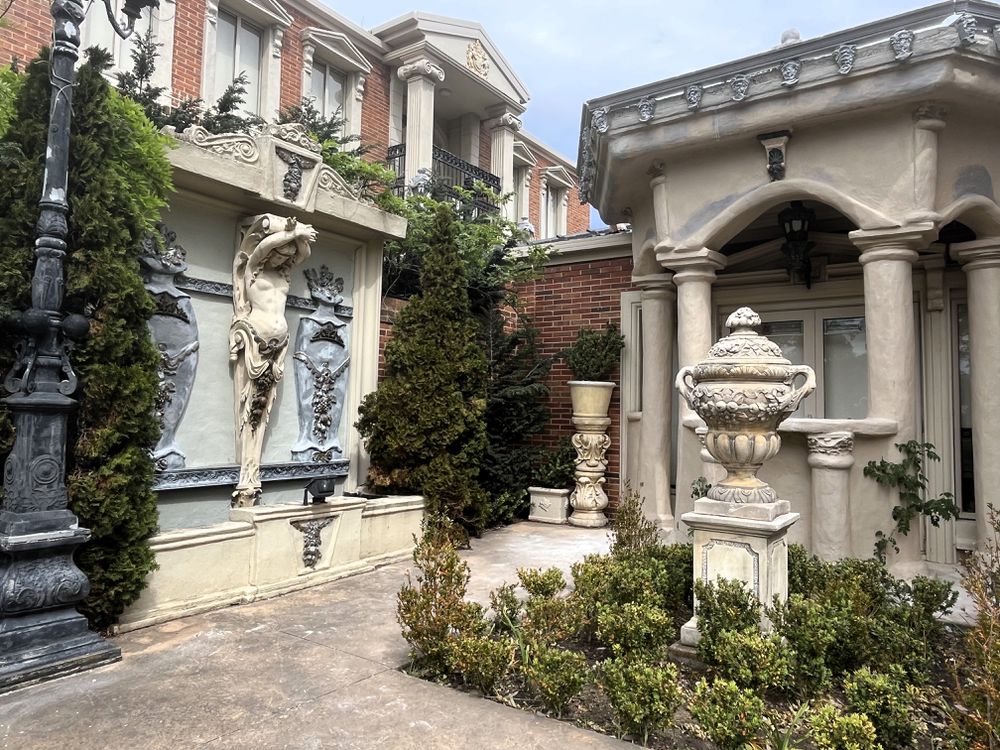 * Entry to the home is through the unique, large gates and into a front courtyard filled with garden beds and statues