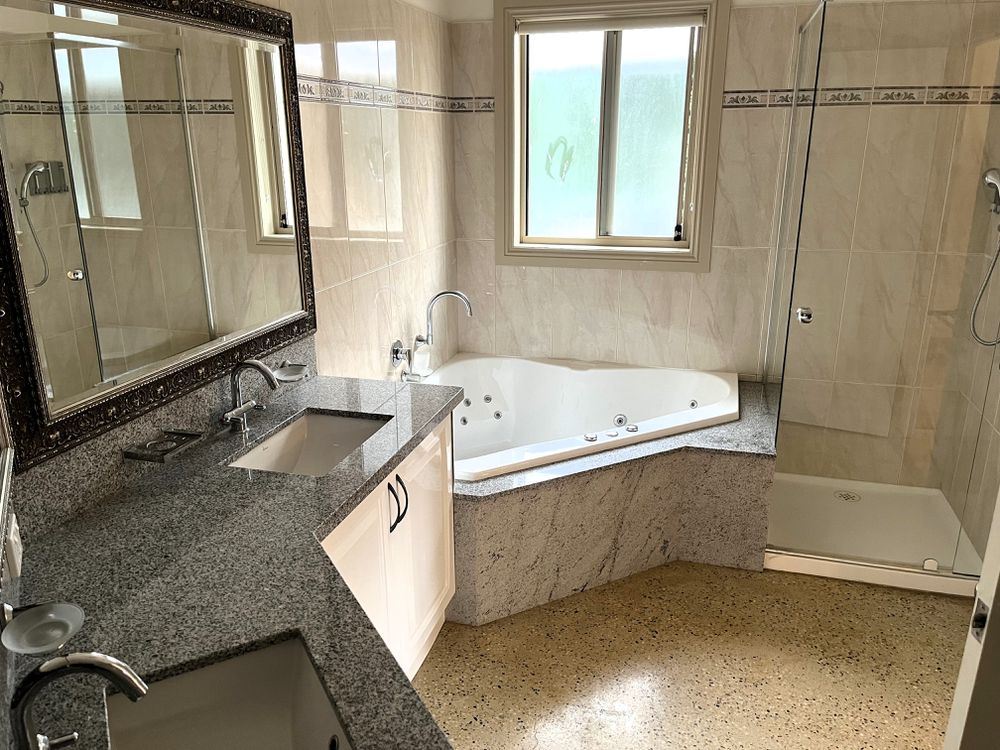 * On the right of the entrance hall, a generously sized main bedroom, capable of housing the largest king size bed, has an oversized walk in robe, split system for aircon and heating, full sized ensuite with bath and double vanity