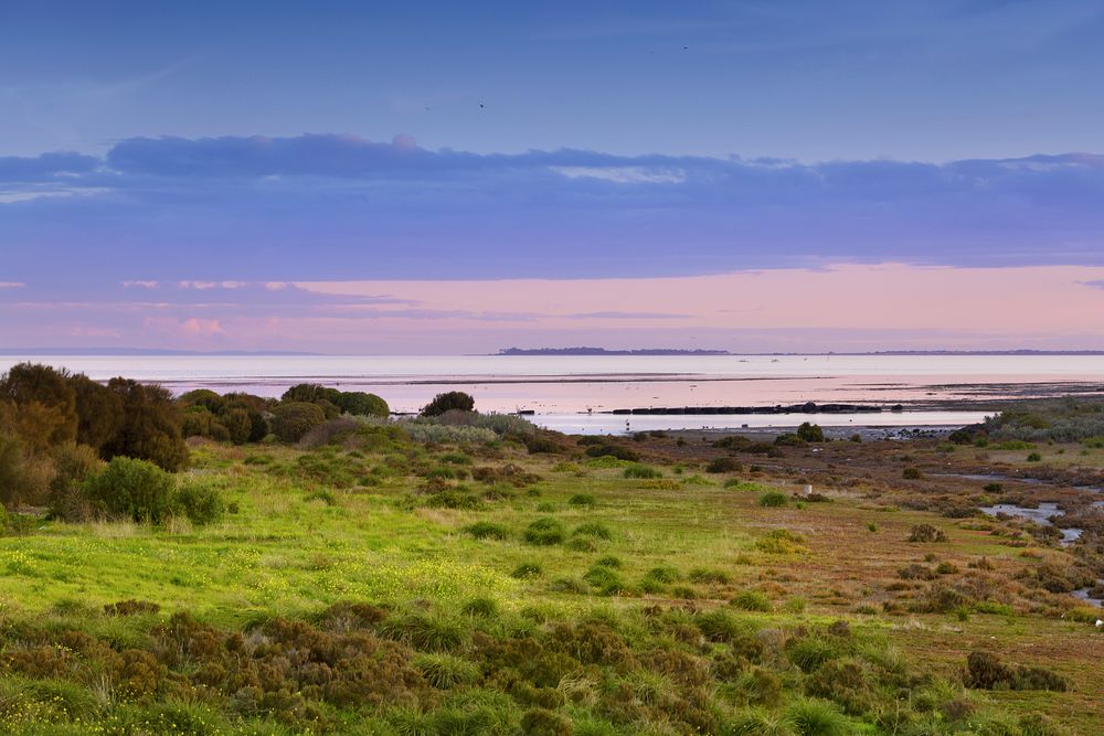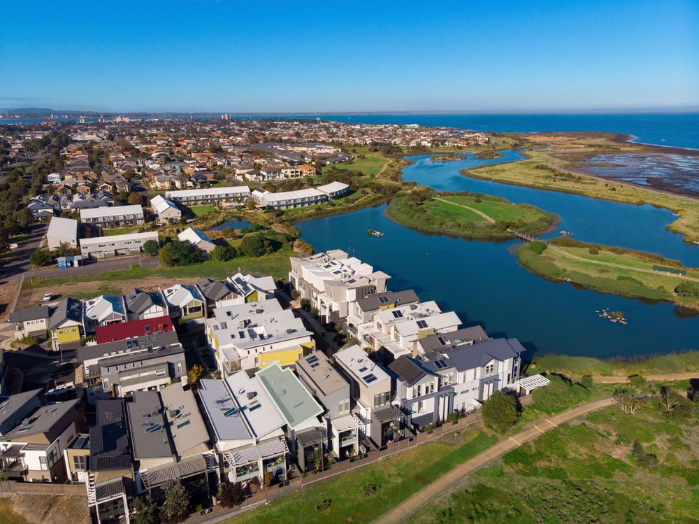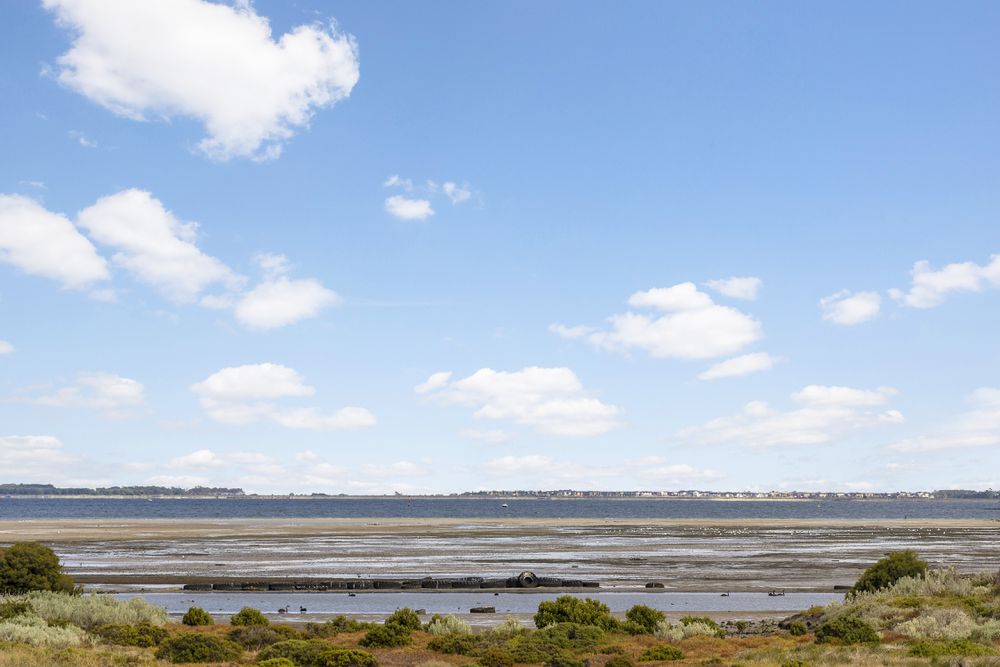 Upstairs, the open-plan kitchen, living, and dining area captures sweeping views across the Jawbone Bird Sanctuary and Port Phillip Bay, opening onto a generous balcony perfect for entertaining or simply soaking up the scenery.