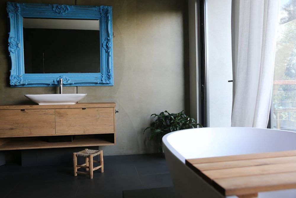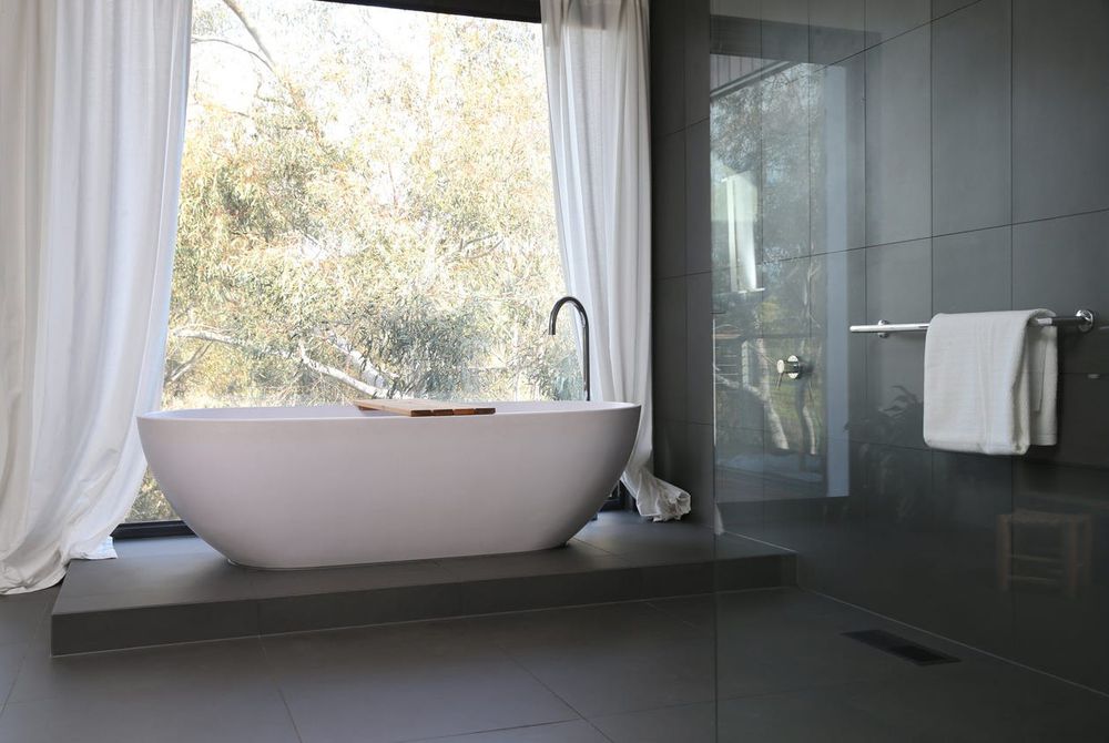 * An impressive family bathroom has a fantastic freestanding bath which overlooks the outside bushland and large walk in shower