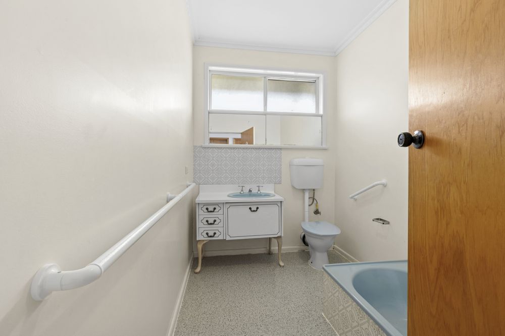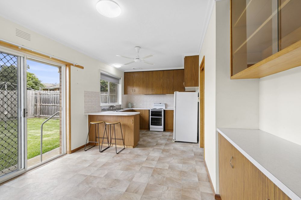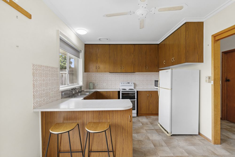 • Original kitchen in well looked-after condition, boasting ample cupboard space, overhead storage, and a dedicated meals area with buffet cabinetry and extra bench space. A ceiling fan and sliding door provide easy flow to the backyard.