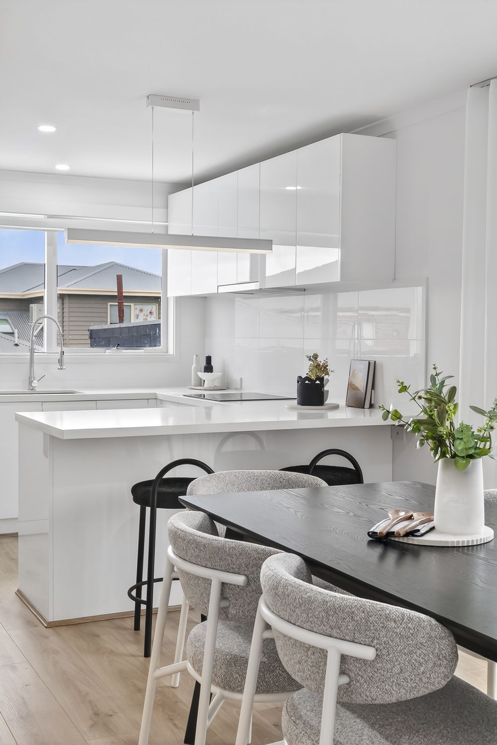 Step inside to light-filled interiors and contemporary finishes. The open-plan kitchen, dining, and family zone is the heart of the home, featuring stone benchtops, sleek cabinetry, quality appliances, and chic pendant lighting.