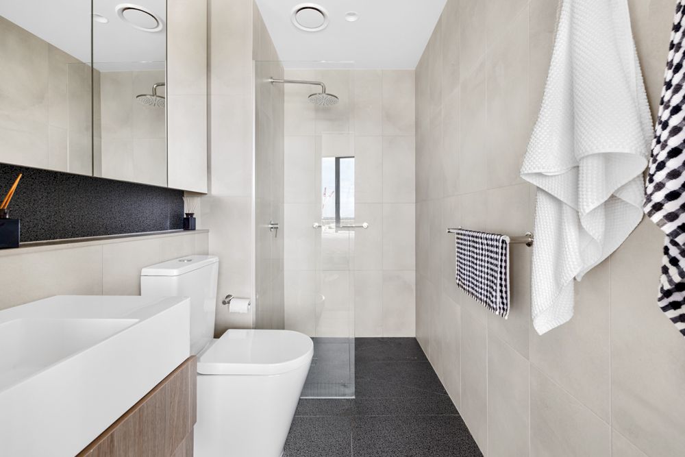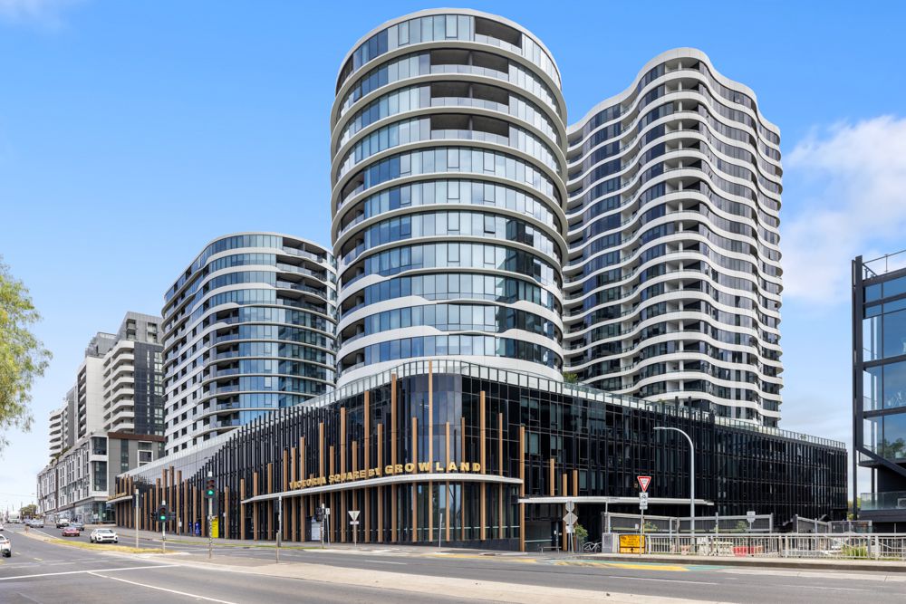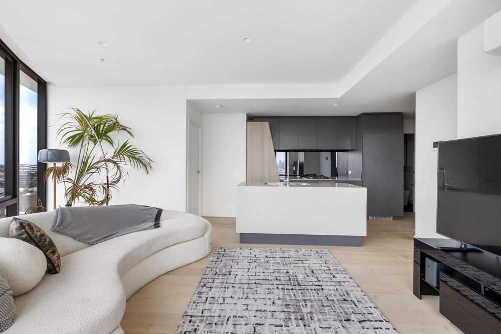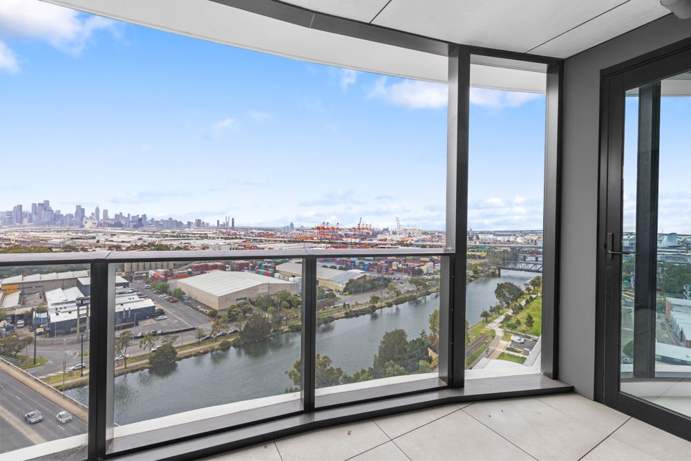 Elevated on the 13th floor, this architecturally designed apartment showcases spectacular CBD skyline and Maribyrnong River views through a striking curved wall of floor-to-ceiling glass. The light-filled open-plan living and dining area flows seamlessly to a private balcony, creating an impressive space for both everyday living and entertaining.