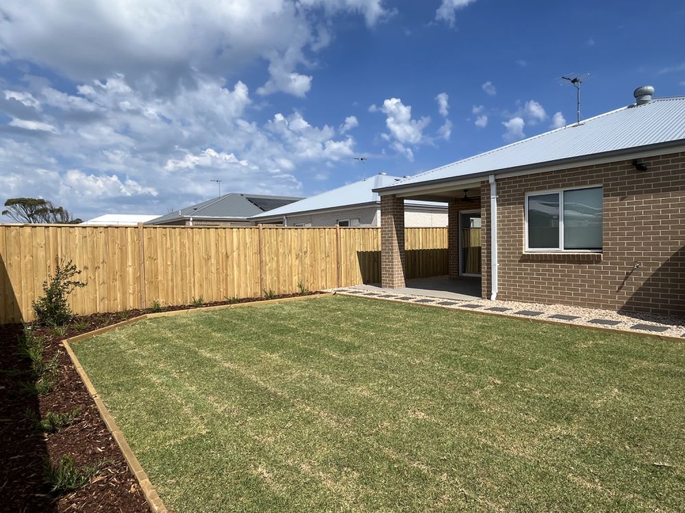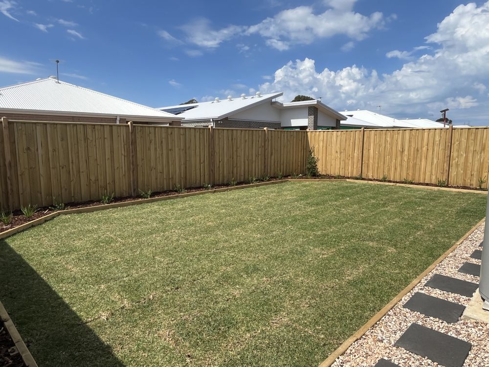 * North facing backyard with newly laid turf and stoned paths