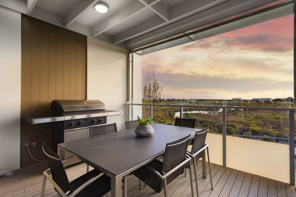 -West-facing undercover balcony with built-in speakers, gas and water connections, plus electric blind