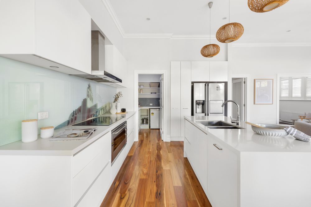 • Designer kitchen with feature splashback and butler's pantry overlooking open plan living and dining